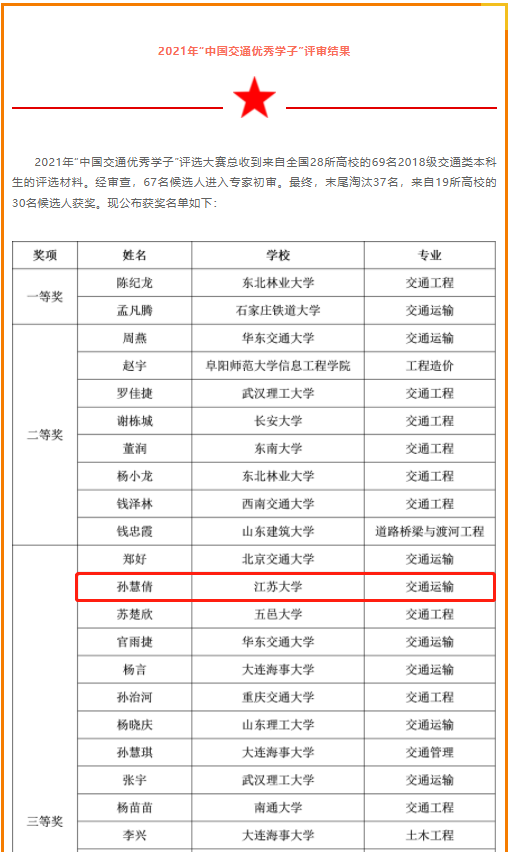 喜报:我院2018级孙慧倩同学喜获2021年“中国交通优秀学子”荣誉称号