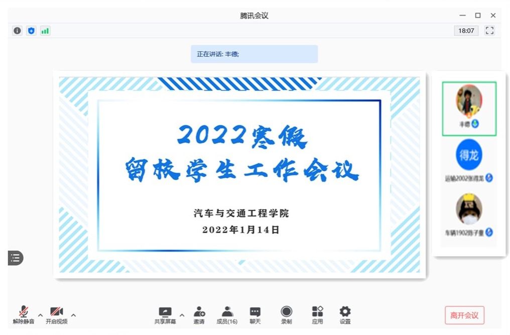 会上,丰老师主要从四个方面做了强调。首先,丰老师通报了学院留校学生情况和寒假时间安排。随后,丰老师就寒假学校的后勤保障工作给同学们做了详细的介绍,主要包括假期学生住宿、餐饮、校园交通、一卡通充值、浴室、体育馆、图书馆等方面的相关服务安排,并转达了学校会在合理统筹规整学校资源的基础上,竭力满足留校学生的假期生活需求。然后,丰老师就同学们防疫、出行、人身、财产、防范网络诈骗等方面的安全做出了提醒,重点强调了寝室安全用电和防范网络诈骗。最后,丰老师要求留校学生严格遵守学校寒假管理和安排,保持信息畅通。有困难及时联系辅导员或丰老师,学校、学院将尽力服务好留校学生的学习和生活,确保寒假期间同学们度过一个平安祥和的假期。