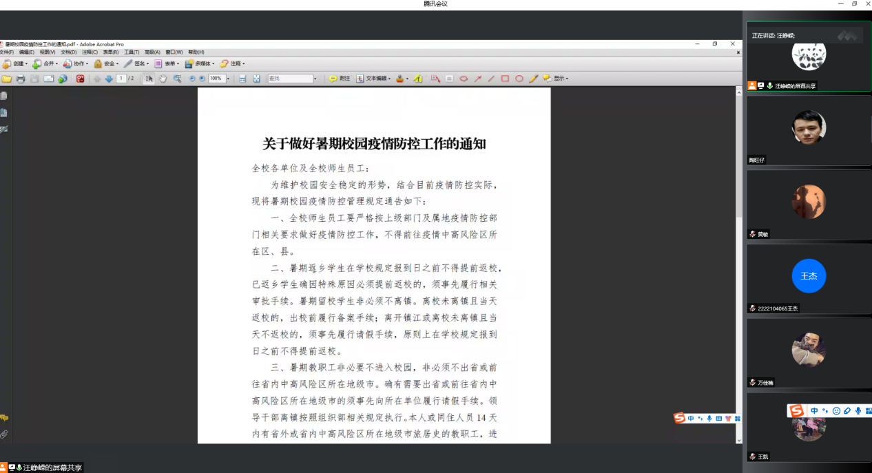 根据学校《关于2022年暑假及暑假前工作安排的通知》文件精神,为做好我院暑假留校研究生的教育管理等相关工作,7月4日我院召开线上暑期留校研究生安全工作会议,各班班委、工作室心理委员以及留校负责学生代表出席本次会议。