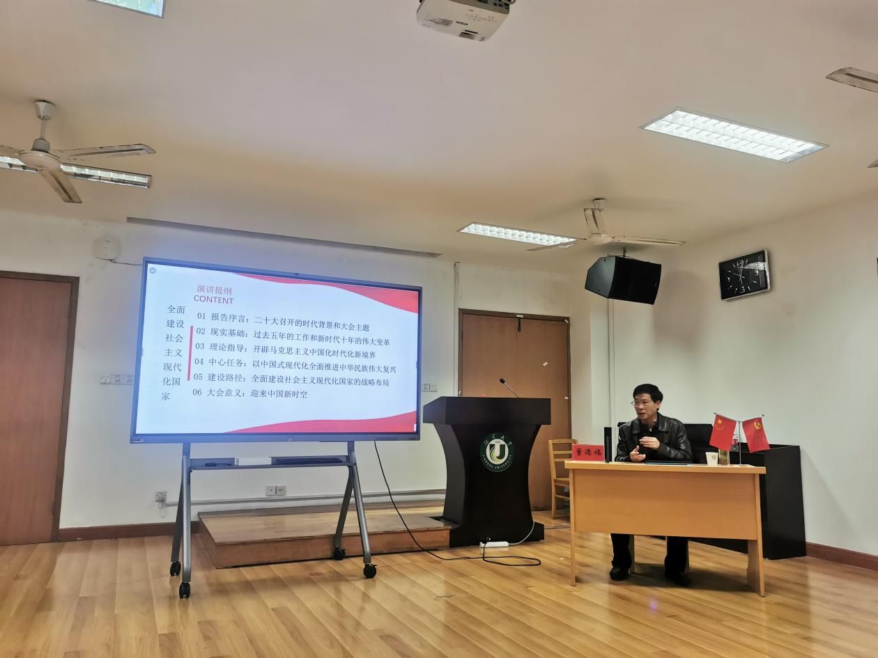 报告会上,董德福教授从二十大召开的时代背景和大会主题、过去五年的工作和新时代十年的伟大变革、开辟马克思主义中国化时代化新境界、以中国式现代化全面推进中华民族伟大复兴、全面建设社会主义现代化国家的战略布局、迎来中国新时空这六个方面为我们清晰阐述了全面建设社会主义现代化国家,紧贴党的二十大报告内容,让我们对中国式现代化、对党的二十大精神进行了全面系统深入的宣传解读。