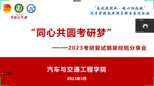 ‘研’途有你,朋辈助力。为帮助我院考研学子突围校外复试,3月23日,学院举办2023年考研复试朋辈经验线上分享会,分享会特别邀请成功升学武汉理工大学和合肥工业大学的胡佳丽、程谭龙同学作为分享嘉宾。2023届拟校外复试的参加,会议由毕业班辅导员张杜主持。