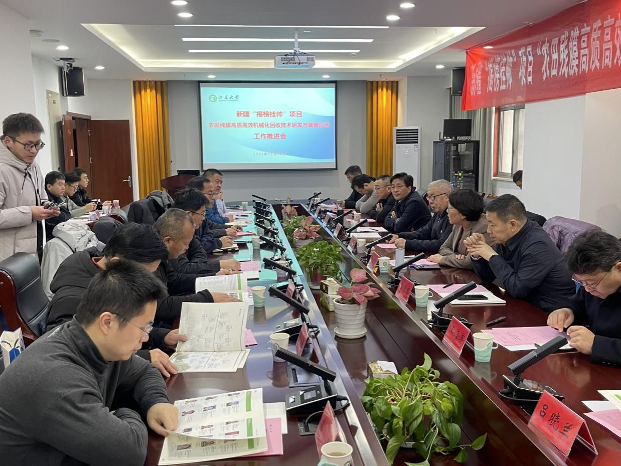 12月23日上午,新疆维吾尔自治区“揭榜挂帅”项目“农田残膜高质高效机械化回收技术研发与装备应用”项目推进会议在英国上市公司官网365耒耜大楼304会议室举行。石河子大学陈学庚院士,江苏大学校长邢卫红,校办主任王海军,科技处副处长李军,新疆维吾尔自治区农机发展中心朱堂忠副主任,新疆农机推广站站长刘晨,农业农村部南京农机化所胡志超,365英国上市党委书记施爱平,新疆农业科学院、常州汉森机械股份有限公司、新疆农业大学、新疆智创环保科技有限公司等单位代表出席会议。