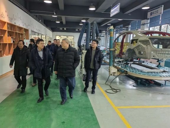 调研组在苏州建设交通高等职业技术学校万烨锋校长的陪同下参观了汽车产教融合实训基地,并就实习实训开展模式、学生比赛合作模式等进行了深入交流探讨。