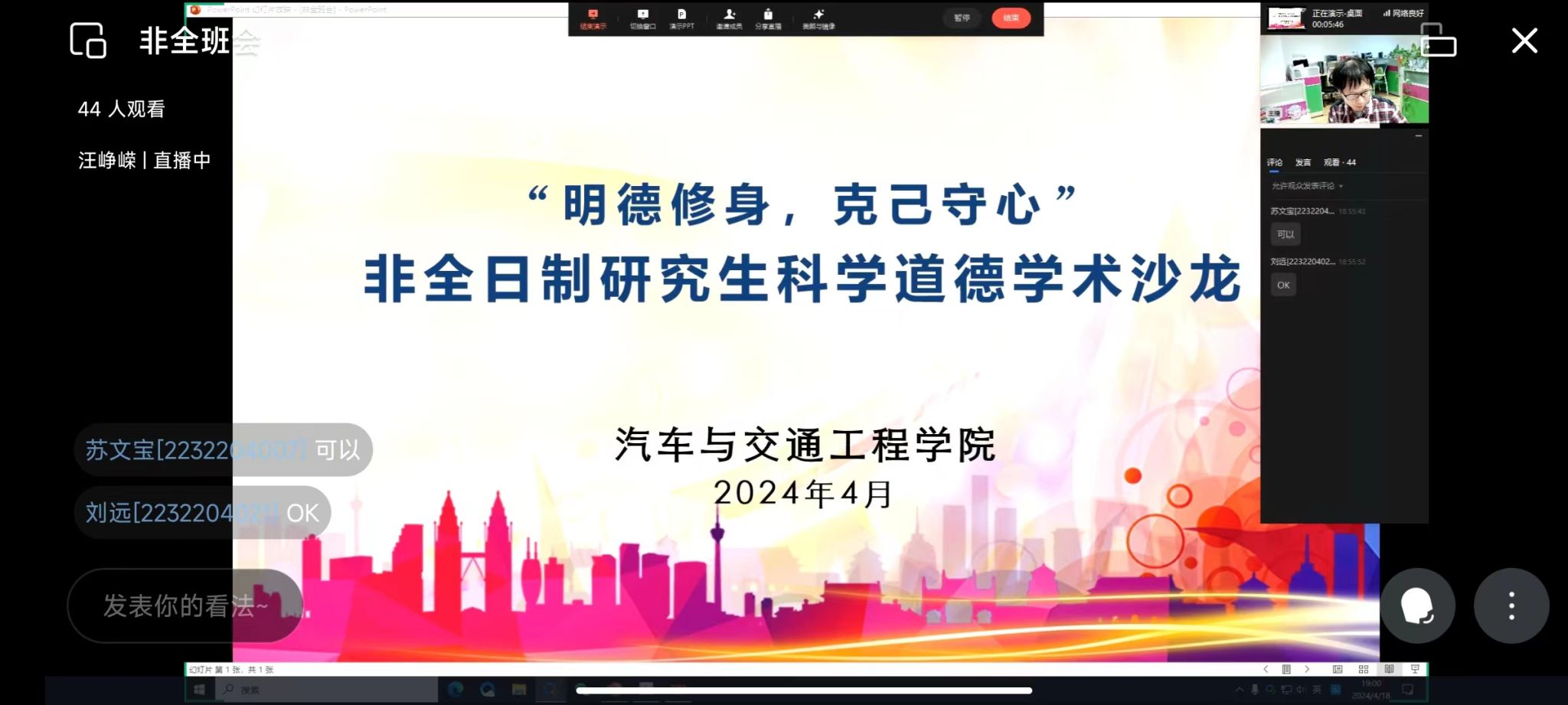 为进一步提升研究生的学术道德素养,营造良好的科研氛围,4月18日,365英国上市在线上平台举办了“明德修身,克己守心”非全日制研究生科学道德学术沙龙,由研究生辅导员汪峥嵘主持,约50位非全日制研究生参加。