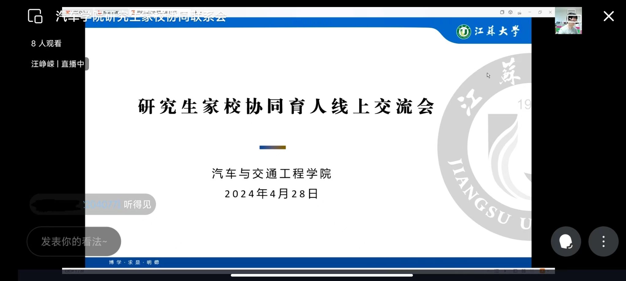 通过云家访,汪峥嵘老师详细介绍了学校的奖助办法,进一步提高学生、家长对资助政策的知晓度,鼓励研究生们正视困境,树立信心,勇于进取,自立自强。同时,还介绍了学校有关心理咨询的途径和政策,也对防范电信网络诈骗作了重点提醒。