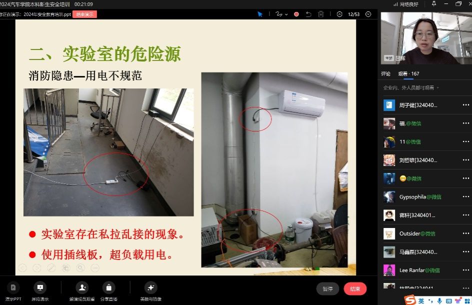 吕老师详细介绍了实验室中可能存在的各种危险源,包括化学试剂、电气设备、机械旋转件等,并指导同学们如何正确识别和处理这些潜在风险。她强调实验室守则的重要性,包括个人防护、设备操作规范、紧急情况处理等安全常识,确保每位新生都能遵守实验室规则,保障自身和他人的安全。
