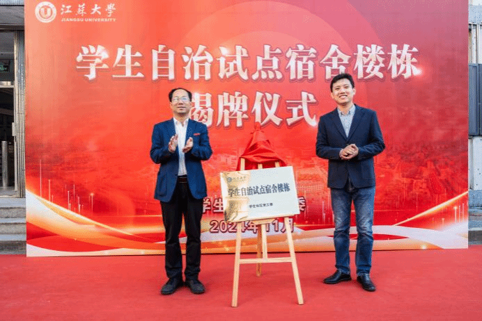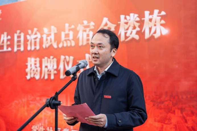 任泽中与卓岩松共同为学生自治试点宿舍楼栋揭牌。