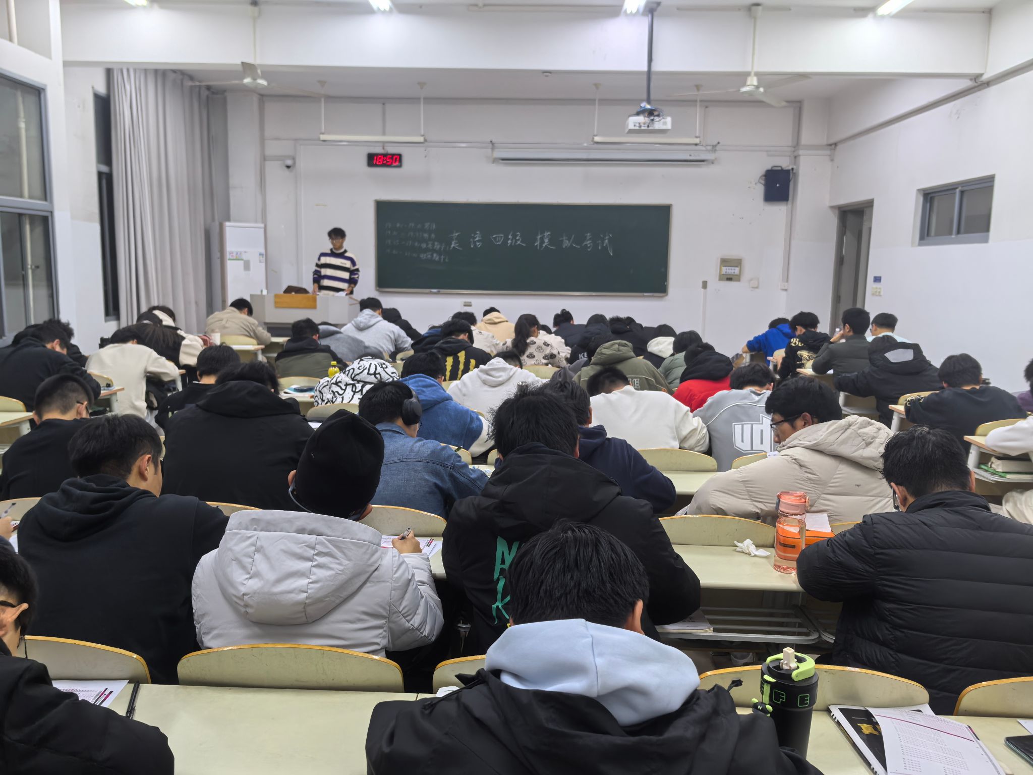 当晚,各个考场布置得井然有序,无论是各考试环节的时间分配,还是涂卡规范、考场纪律监督,都精准复刻真实四级考场情境,让学生沉浸式体验考试全程,全方位感受应考氛围。考场上,同学们全神贯注,认真审题、作答,展现出积极备考状态。
