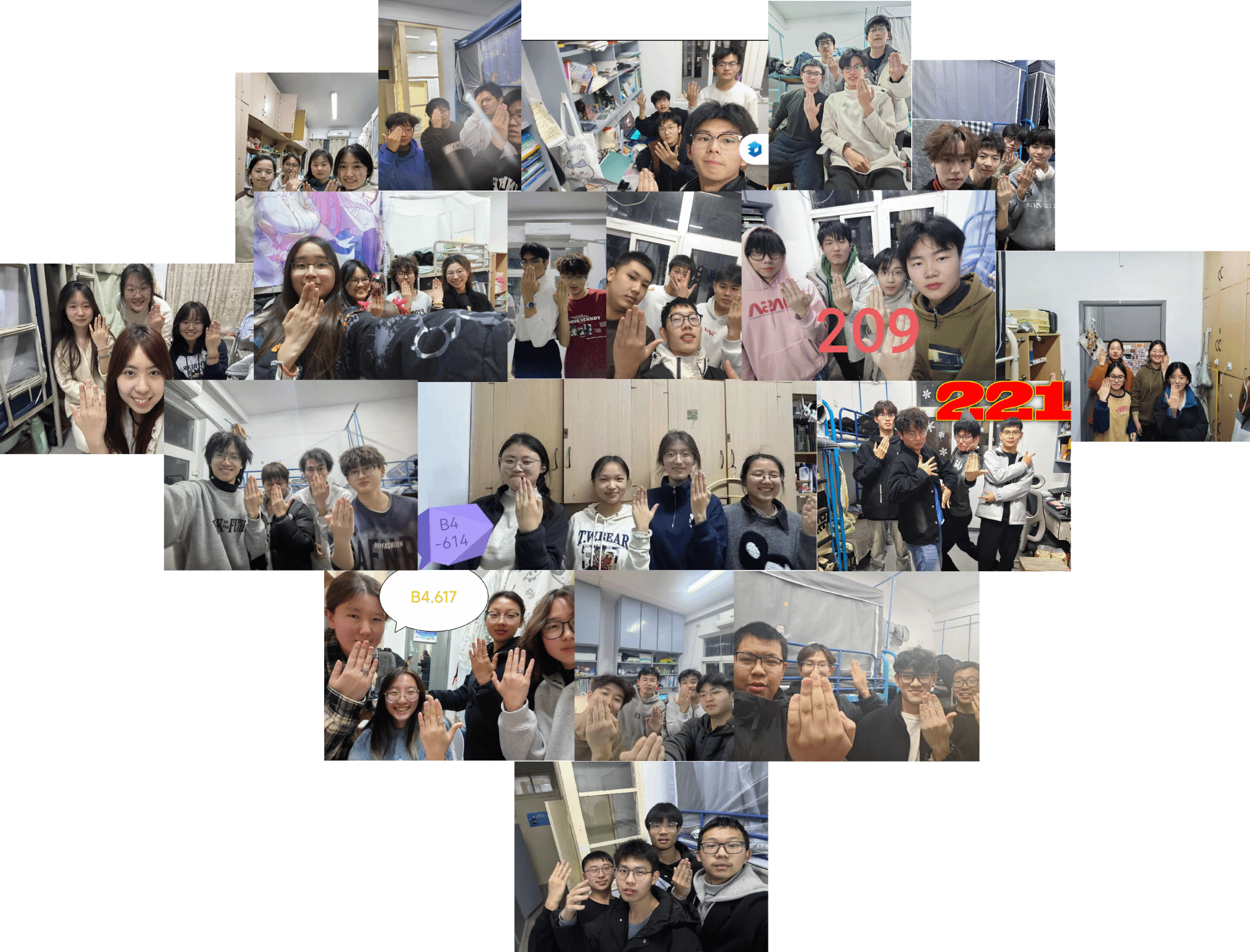 活动开始于晚上十点,辅导员杨扬在寝室长群内发布活动通知“拍摄属于宿舍的专属Pose”,是一张“人生,易如反掌”的图,同学们根据这张图片,发挥自己的想象力,尽可能还原图片,摆出宿舍的专属Pose。