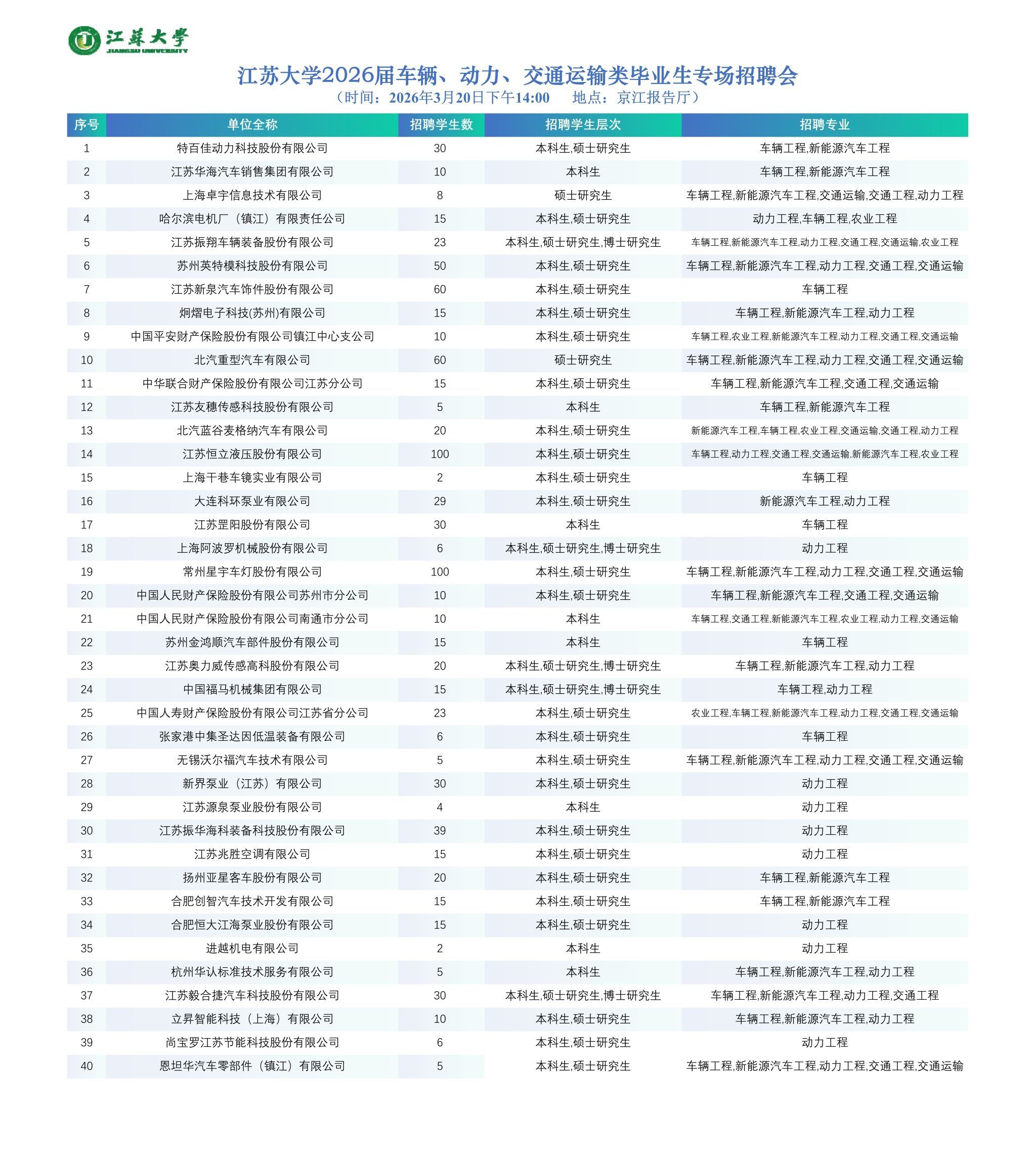 2026年3月20日(星期五)14:00,在英国上市公司官网365(校本部)京江报告厅,举办英国上市公司官网3652026届车辆、动力、交通运输类毕业生专场招聘会,以下是各参会单位的招聘信息。