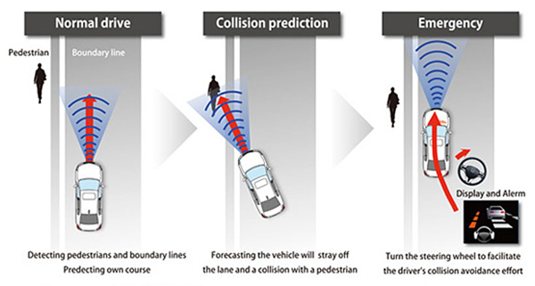 当车辆靠近行人时,行人碰撞缓解系统将开始施加温和的压力给刹车,以提供预警。如果驾驶员没有及时刹车,系统将大力踩刹车,并提供声音和视觉上的警告。与此同时,系统还会给方向盘施加作用,使汽车转向远离行人。