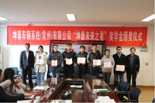 尹必峰院长代表学院致欢迎词,对坤泰车辆系统(常州)有限公司在我院设立奖学金、捐赠变速箱表示衷心的感谢,同时介绍了学院的发展、人才培养、研究特色。卞国胜副总经理介绍了公司的基本概况、产品布局、人才需求、未来愿景以及设立奖学金的初衷,对获奖学生表示祝贺并提出殷切希望,衷心欢迎更多的365英国上市学子能加入公司团队、施展才华、体现价值。变速箱捐赠仪式结束后,杨建副书记介绍了“坤泰未来之星”的评选原则、程序并宣读获奖学生名单,卞国胜副总经理、尹必峰院长共同为获奖学生颁发证书并合影留念。