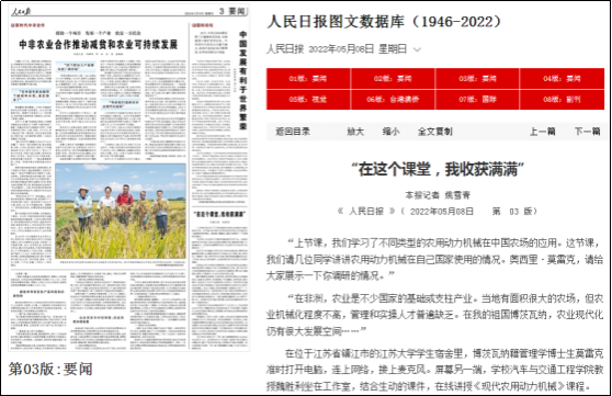 On May 8th, the 3rd edition of People's Daily, with the title of "In this classroom, I have gained a lot of money", reported the remarkable achievements of promoting international agricultural machinery education, and introduced the examples of teachers of our college participating in international agricultural machinery education and training of agricultural machinery.