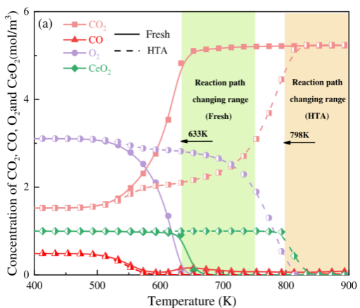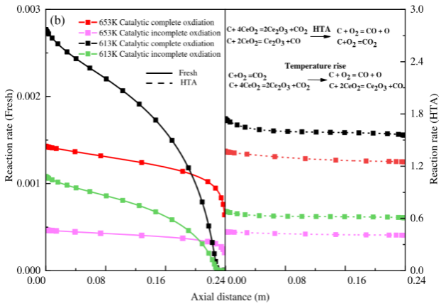 Through the Ce based catalyst metal oxide modification, prof. Wang Pan team of different aging state catalyst smoke low temperature catalytic combustion performance and NOx collaborative oxidation performance in the experimental and theoretical research (Fig. 1), the depth reveals the hydrothermal aging and metal oxide modification of Ce based catalyst in NOx synergy in the basis of soot catalytic combustion evolution mechanism. In addition, Prof. Wang Pan's team systematically analyzed and studied the change of soot catalytic combustion performance and the catalytic combustion reaction path change based on the "zero-dimensional" heat transfer and mass transfer model.