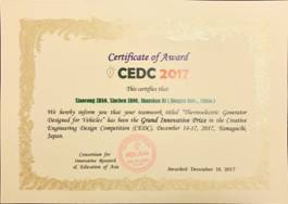 Paper of Student (Zhao Xiaocong) from our school— ‘Design and Numerical Study of a New Thermoelectric Generator with Flow DivisionControl’ won the ‘Best Paper Prize’ in ICIARE2017. Research work from team (Zhao Xiaocong, Zhou Xinchen, Bi Shanshan) in our school— ‘Thermoelectric Generator Designed for Vehicles’ won the ‘Grand Innovative Prize’ in CEDC2017. It is reported that this prize is specially set as the Top Honor Prize.