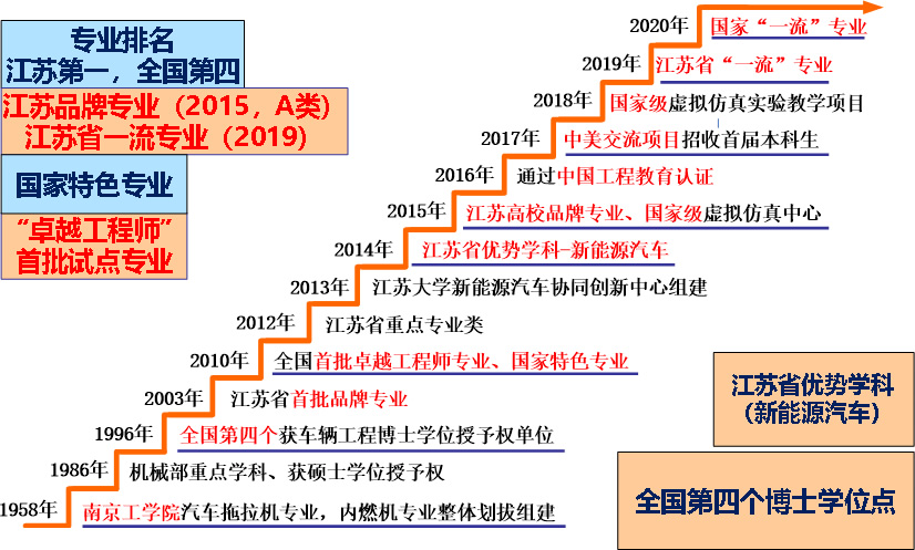 英国上市公司官网365是全国最早设立车辆工程专业的三所高校之一,根据中国管理科学研究院《2015中国大学评价》我校位于第55名,车辆工程专业是江苏省首批品牌专业(2003年)和重点专业类中的专业(2012年),2010年获批国家级特色专业、教育部首批“卓越工程师培养计划”试点专业,2013年获批“英国上市公司官网365—南京汽车集团有限公司工程实践教育中心”。 在2014年省“十二五”重点专业建设情况中期检查中,本专业为核心专业的英国上市公司官网365“机械类”专业获评“优秀”等级,这是全省23个重点建设机械(类)专业中获评“优秀”等级的2个之一。2018年获批国家虚拟仿真项目。2020获批国家一流本科专业建设点。专业核心课程《汽车构造》获评国家一流课程。英国上市公司官网365是中国汽车工程学会副理事长单位,中国机械工程教育协会车辆工程专业教学指导委员会的副主任委员单位、江苏省汽车工程学会副理事长单位、江苏省卓越工程师联盟发起单位,全国汽车轻量化产业联盟成员单位。