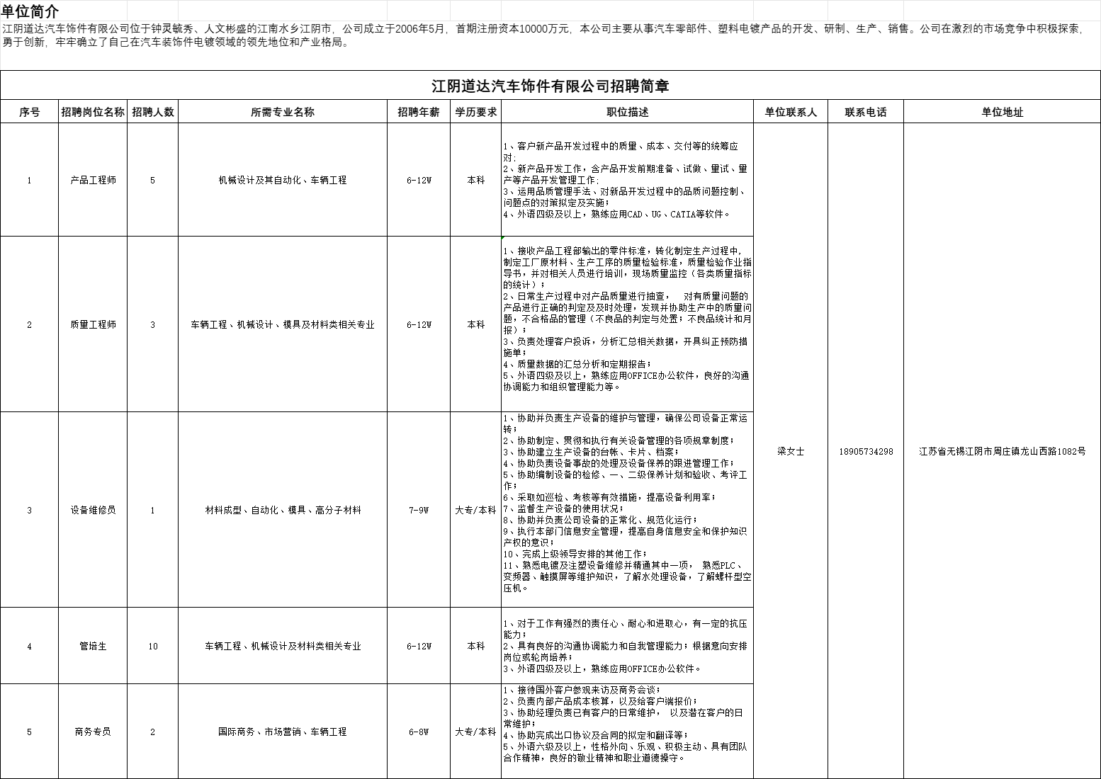 江阴道达汽车饰件有限公司2024招聘信息