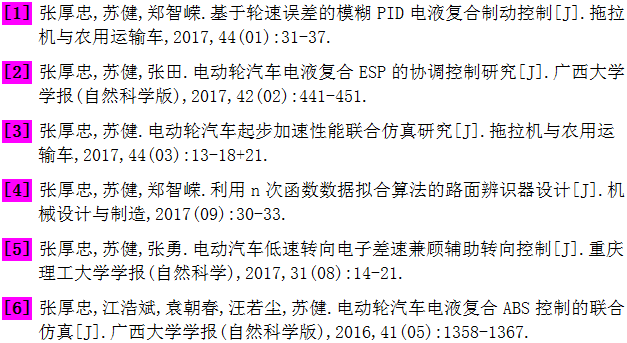 科研项目 | ◆ 2014年度江苏省高校自然科学研究面上项目(14KJD580001) 项目名: 运用电机提升电动轮汽车电液复合ABS性能的控制研究 ◆ 江苏省2017年度第十四批“六大人才高峰”高层次人才项目(JXQC-042) 项目名: 电动轮汽车电液复合ABS的耦合改良机理与协调控制 |