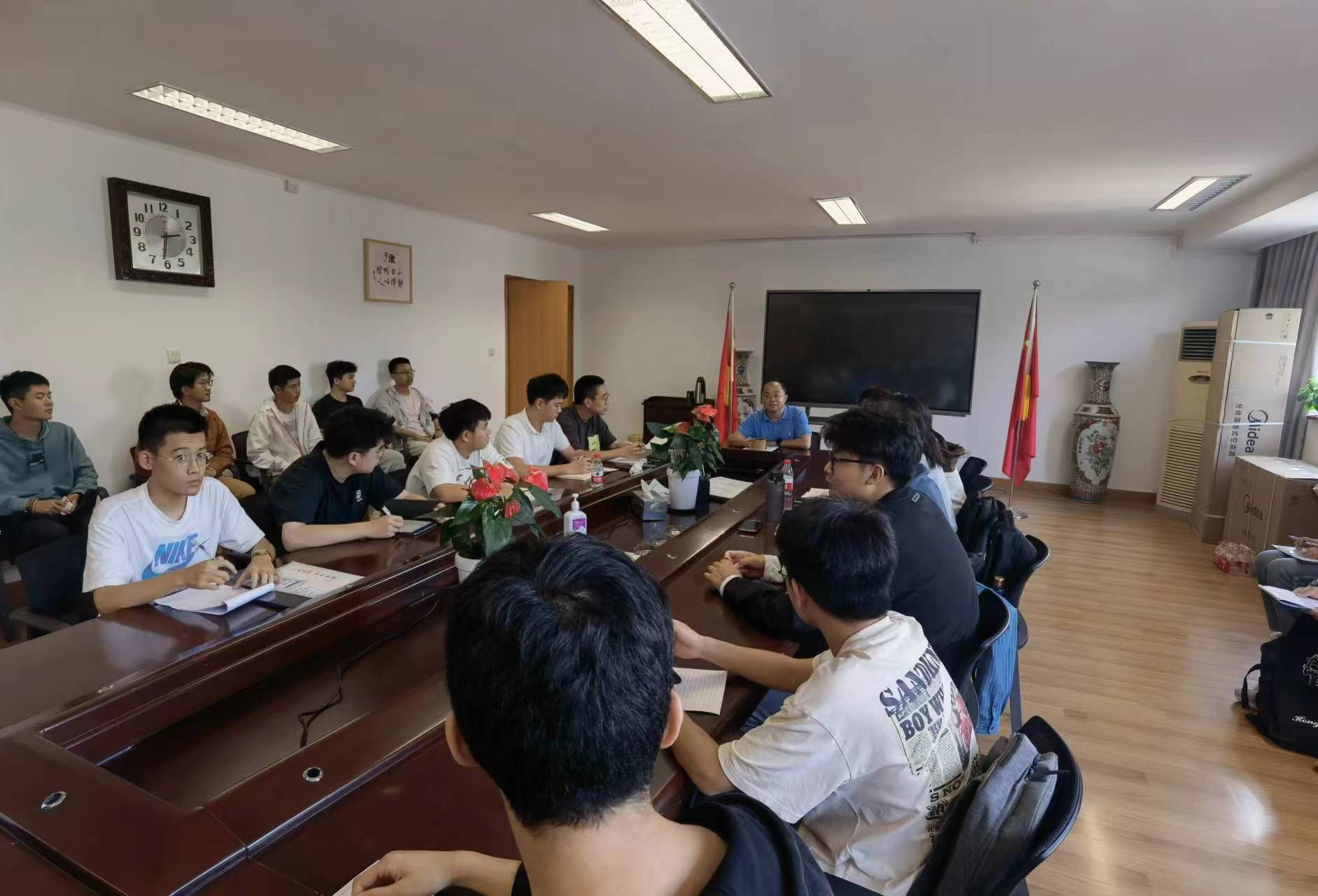 首先杨建书记对新生班委的到来表示欢迎,肯定并赞扬了新生班委自开学以来的付出和努力,他表示新生班委要保持良好的精气神,要勇于提出自己的看法建议。随后就目前的班级管理、寝室卫生、日常学习等方面,三位老师与同学展开了积极的交流。
