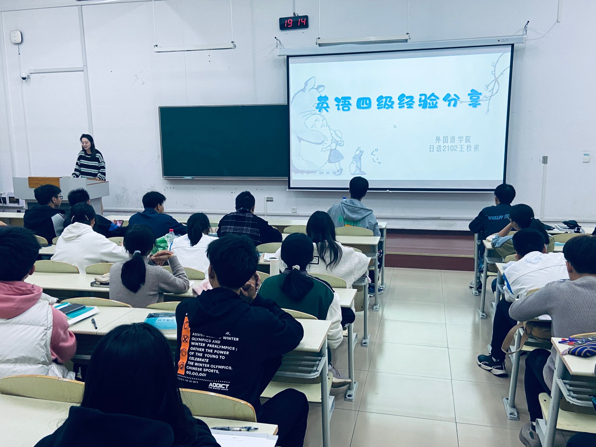 分享会上,主讲人徐尧瑶同学为同学们分析了考试题型,重点讲解了英语听力高分技巧——“五步精听法”和写作金句分析;王敉祺同学重点讲解了各类阅读题型的答题技巧,并与同学们展开积极互动;殷沄菲同学重点讲解了翻译题型的高分技巧,并以具体示例讲解了“中式翻译”的误区。
