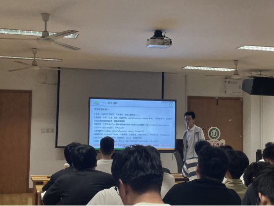 第一位进行分享的是张辉同学,他围绕学习资料的寻找、资料的推荐、学习软件的推荐等方面分享了自己的学习经验。他建议打架通过阅读与自己研究课题相关的书籍,利用知网、万方等网站查阅相关文献,尽快确定自己的研究方向。学长强调有针对性地选择精读或泛读的重要性,并推荐使用文献管理工具如EndNote、NoteExpress进行文献管理,提高阅读的效率。此外,张辉同学还分享了一些进行数学计算的相关软件,如 MATLAB、CarSim等,还推荐了一些方便研究生进行汉英转化和英语语法检查的在线资源。最后,张辉同学提醒大家要善于做笔记,在学习过程中及时记录重要内容,以便更好地总结和理解所学知识。