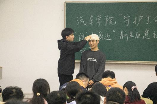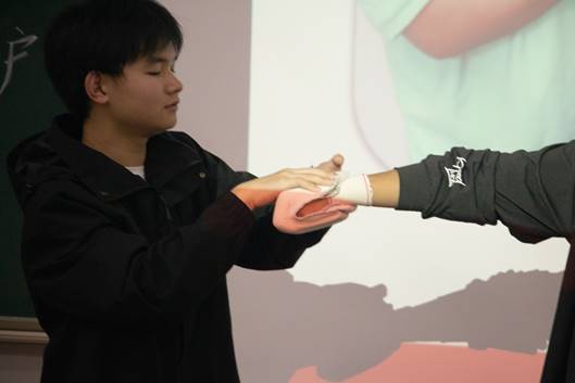 经过简短的介绍,志愿者们先向同学们普及了急救的基础知识并以基本概念为主、相关事例为辅,向同学们展示不同创伤的处理方法。随后到了实践环节,基础包扎和CPR心肺复苏教学使同学们了解了基本的急救护理的知识,并逐渐掌握基本的急救护理的方法,有助于大家在遭遇急病或意外伤害时能够实现科学的自救互救。