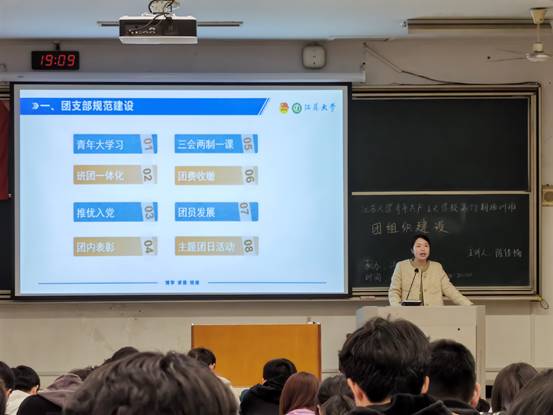 本次团课主题为“团组织建设”,团课共分为四个部分。首先,陈佳楠老师介绍团组织最基本的单位——团支部的规范建设,通过八项基础工作展开,分别是青年大学习、班团一体化、推优入党、团内表彰、三会两制一课、团费收缴、团员发展、主题团日活动,帮助参会团干部们梳理了基础团务的流程和细节。接着,陈老师又介绍了团支部的活力建设,她从“三纵四横五协同”、优秀主题团日活动、十佳活力团支部、支部风采大赛、团支书沙龙五个方面,由浅入深地向同学们介绍了支部活力激发的载体和渠道,强调了团支部活力建设应从基本工作做起,有条理、有层次地推动团支部各项活动的展开,引导团员青年积极参与到团内事务中。接着,针对团组织建设所需用到的两个重要平台,陈老师进行了细致的讲解。首先是针对PU口袋校园,陈老师强调了使用核心原则,“缘起于团,服务于团”,要善于运用平台,更好地开展支部管理和建设工作。然后结合新生团组织转入、团员团干部信息及时更新、团支部自检整顿三项工作讲解了“智慧团建”系统的介绍。最后,陈老师通过团组织建设实例,向同学们提出了聚力四项坚持,解决四团问题,实现固本强基的工作建议与要求。