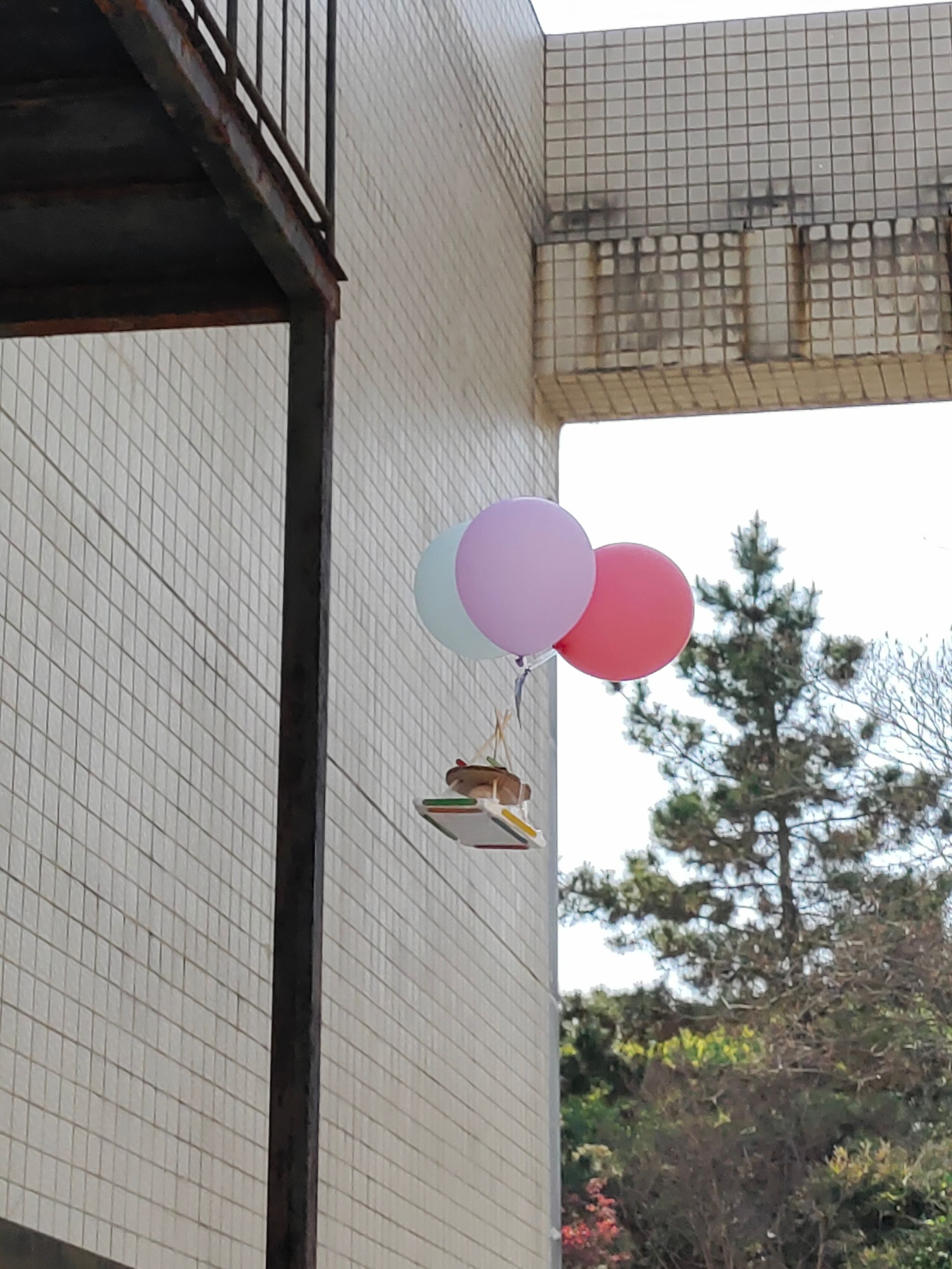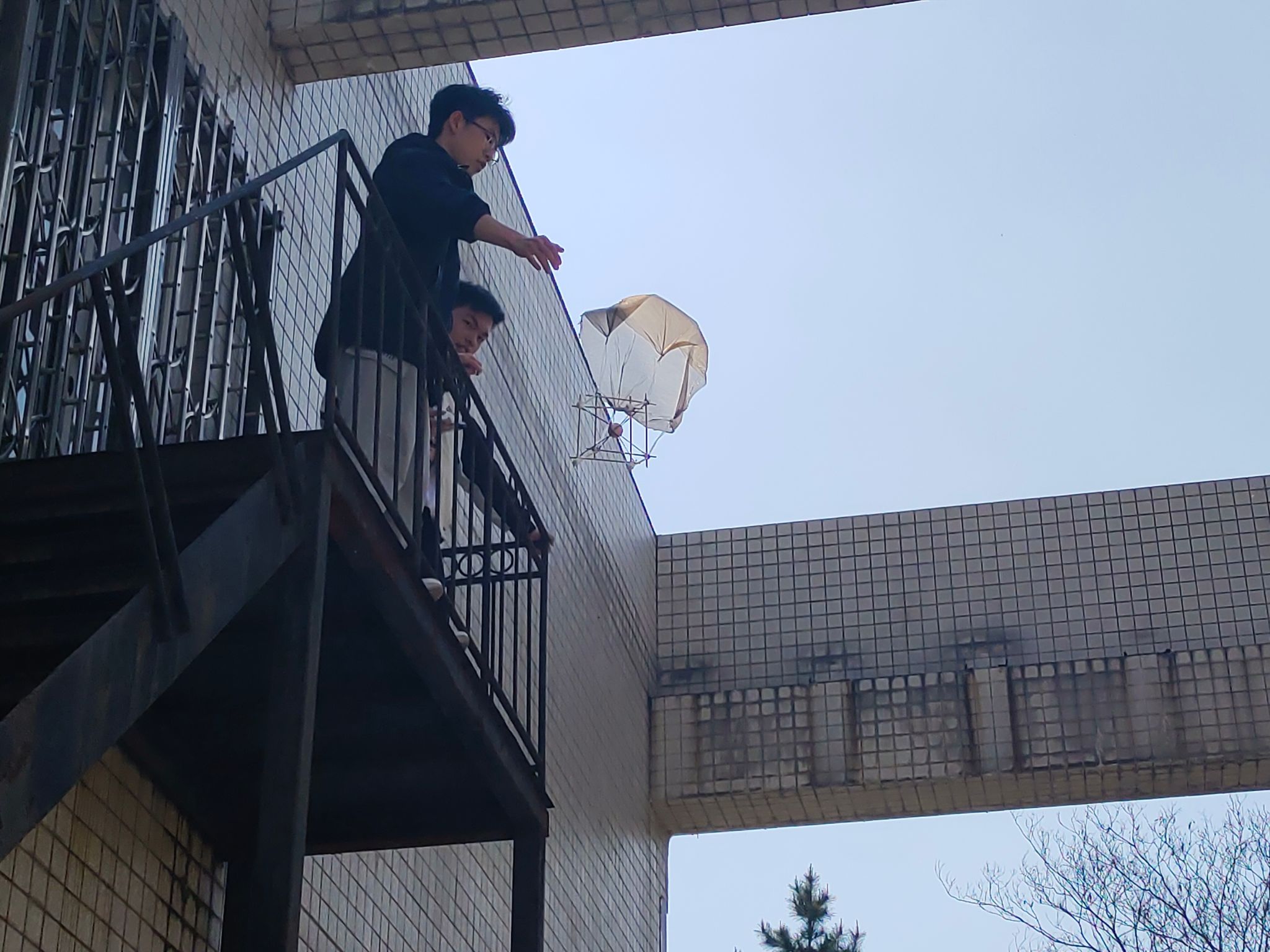 激动的心情被比赛的一声“开始”推到了高潮,当参赛者们的作品一个个丢下来的时候,牵动了所有同学们的心,同学们有时因为“鸡蛋”安全着陆而欢呼鼓掌,有时因为作品的奇葩思路而开怀大笑,也有时因为鸡蛋碎裂而扼腕叹息。评委组现场对各组装置进行外观、轻重、稳定性评分,以综合分最佳者为优胜。