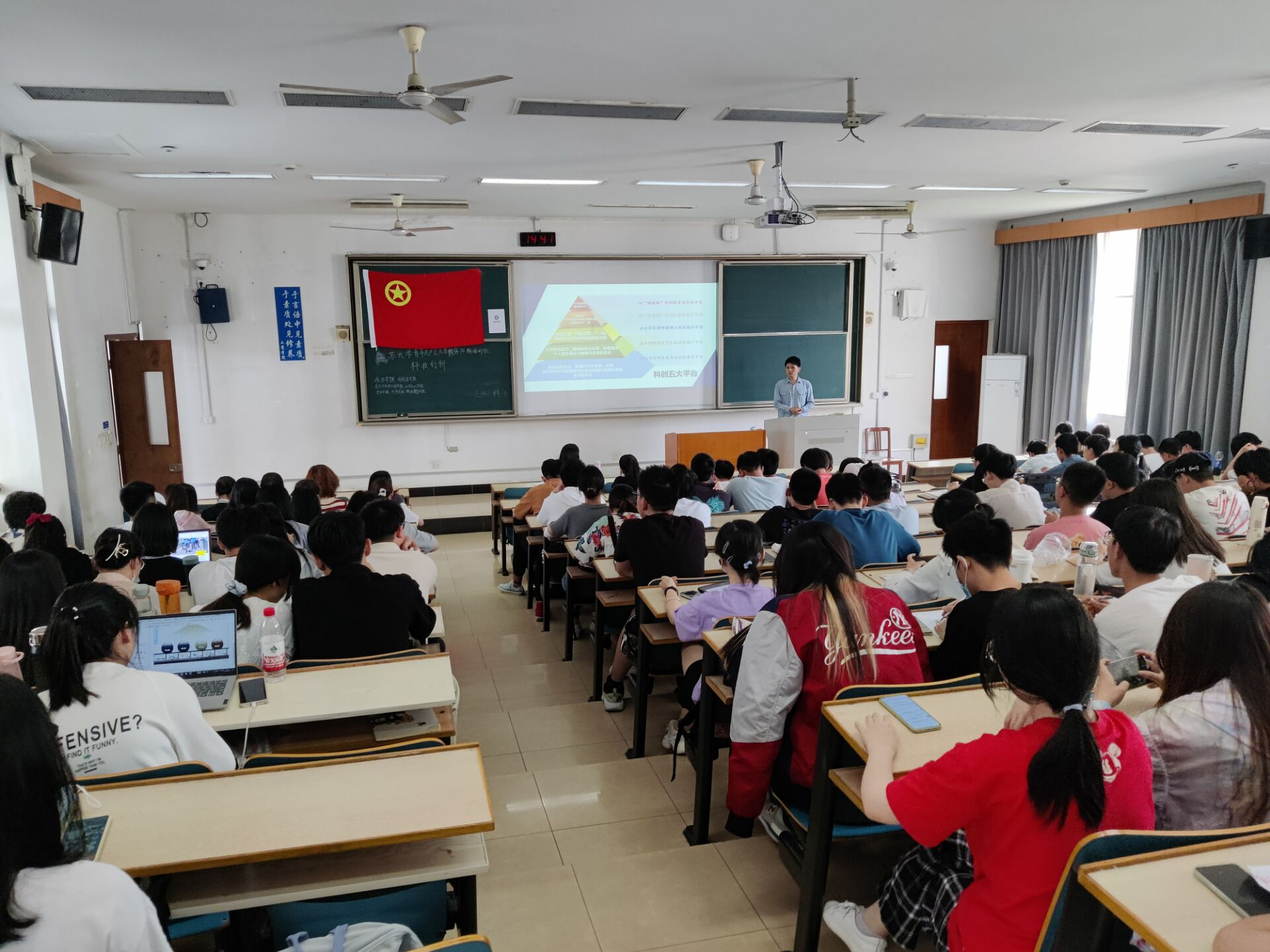 团课伊始,韩涉老师直奔主题,点出了本次团课的具体主题“多彩挑战杯,共筑创新梦”,然后给大家介绍了科创的五大平台。随后韩涉老师详细地说明了挑战杯以及我校挑战杯的情况,科研立项的流程,历史及申报原则。另外,通过观看图片和视频的形式,韩老师用事实向同学们展示创新创业成功人士的历程、各种比赛的宏大场面以及学长学姐参加创新创业比赛时的情况。最后,韩涉老师向我们强调了参与创新创业活动对自身发展有着重要的意义。