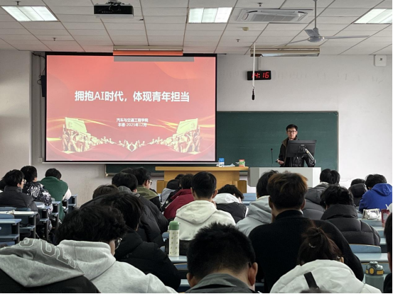 丰德老师从当前人工智能发展的国际态势切入,阐述了AI技术在推动产业变革、提升国家竞争力方面的关键作用。随后,丰德老师结合习近平总书记关于科技强国的重要论述,系统介绍了我国在人工智能领域的战略布局与创新进展,特别是智能驾驶、智慧交通等与汽车专业紧密结合的应用方向。他强调,人工智能不仅是技术革命,更是时代赋予青年的历史机遇,青年学子应主动学习、积极应用、审慎思考,在智能社会中找准定位、贡献力量。