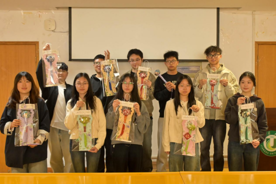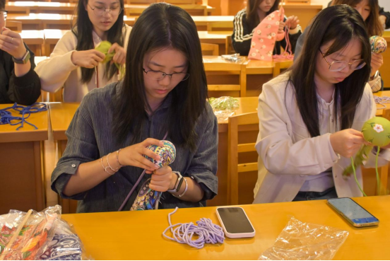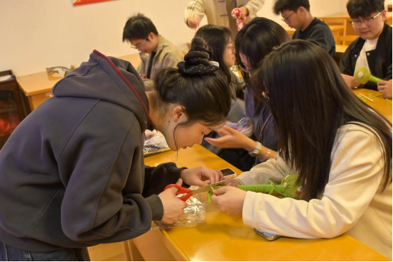 “手作艾草锤,寄予春日安”板块,成为本次课堂的亮点,也是师生参与度最高的环节。在15分钟的时间里,同学们分组开展艾草锤DIY,现场分发了淡绿、鹅黄色棉布、干艾草、木棍、棉绳等材料。熊松清手把手指导大家完成填充、包裹、捆扎等步骤,遇到动作较慢的同学,她会耐心叮嘱“扎绳结时要拉紧,这样艾草才不会散落”。同学们分工协作、相互帮助,有的裁剪棉布,有的填充艾草,有的捆扎固定,最后还用上清明主题贴纸和布条,写下对老人的美好祝福,正如熊松清所说,“每一圈缠绕都是坚守的缘分”,一个个散发着艾草清香的养生锤,成为承载着青春关爱与传统智慧的“健康礼”。