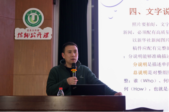 讲坛围绕“如何拍出高质量的校园新闻照片”展开。杨雨老师结合多年新闻摄影实践经验,从拍摄实操中的常见问题入手,详细讲解了水平线校准、连拍避免眨眼、避免人物后背对镜头等基本技巧。他特别强调,会议新闻摄影中“大景全景一定要有”,人物特写应注重背景元素的融入,捕捉人物的动作、神态和表情,才能让画面更具新闻张力。
