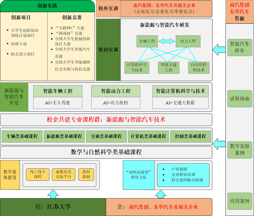在新能源与智能汽车产业学院建设中,学院坚持立德树人根本任务,与南京汽车集团有限公司、东华汽车实业有限公司、奇瑞新能源技术有限公司、北京百度智行科技有限公司、南京金龙客车制造有限公司、江苏悦达投资股份有限公司、北京新能源汽车技术创新中心有限公司绕新能源与智能汽车研发产业人才需求,按照产业对需求人才的知识能力素质要求,打通学科壁垒,跨业界、跨学科、跨专业整合教学资源,共同修订了新能源与智能汽车专业的人才培养方案,构建了多学科融合、创新创业教育的新型实践教学体系,充分体现产教融合特色以及创新型工程技术人才培养要求。