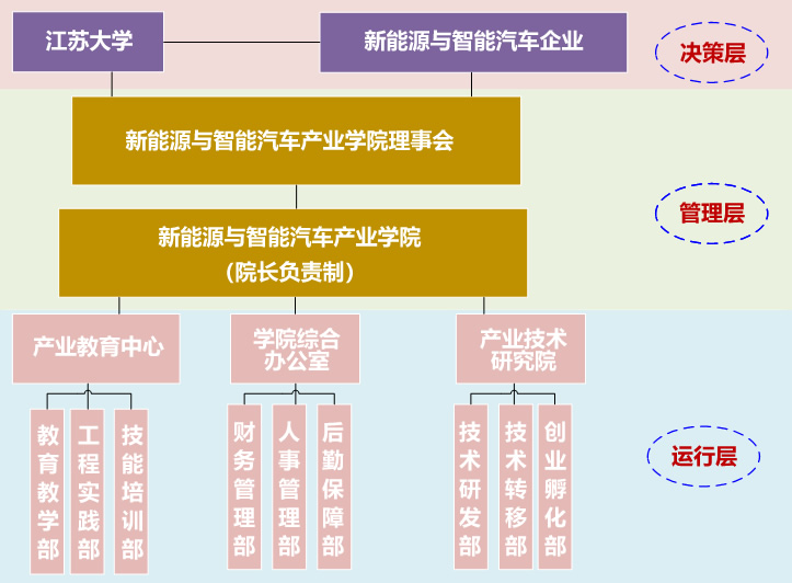 产业学院是我校独立建制的二级单位,由校内和校外两部分组成。校内部分为产业学院本部,校外部分由南汽集团、东华汽车实业有限公司、奇瑞新能源技术有限公司、江苏悦达投资股份有限公司、北京百度智行科技有限公司、南京金龙客车制造有限公司、北京新能源汽车技术创新中心有限公司、南京越博动力系统有限公司等共建企业构成。学校高度重视产业学院建设工作,专门成立了英国上市公司官网365新能源与智能汽车产业学院建设办公室,主任由学校和南汽集团领导共同担任。下设“新能源汽车教学学院”和“智能汽车应用研究中心”,分别承担校企协同人才培养任务和技术研发任务。产业学院由学院行政办公室、行业创新研究室、师资培训部、行业技术人员培训部、科技服务部、招生与就业部等协同实施运行。